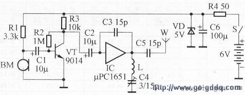 电路工作过程如下:话音信号被驻极体话筒BM接收转换为电信号后,通过耦合电容C1输入到晶体管VT基极。R1为BM的负载电阻。晶体管VT等构成电压放大器,将C1耦合过来的音频信号放大后,经C2耦合输出。R2为基极电阻,R3为集电极电阻。集成电路IC等构成高频振荡器,振荡频率由L、C4串联谐振回路决定,C4是微调电容,用于调节振荡频率。C3为反馈电容。C2耦合过来的音频信号对高频振荡信号进行频率调制,调频信号经C5耦合至天线W发射出去。