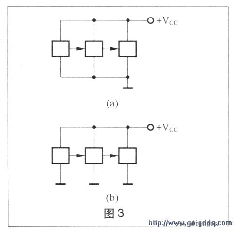 电路图中通常将电源引线安排在元器件的上方,将地线安排在元器件的下方,如图3(a)所示。有的电路图中不将所有地线连在一起,而代之以一个个孤立的接地符号,如图3(b)所示,应理解为所有地线符号是连接在一起的。