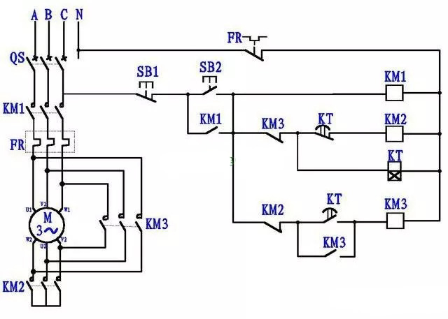 就是对电机的三相绕组在启动时和正常运转时施加的不同的电压,来降低电机启动时的冲击电流。在启动时对电机绕组施加的是星形接法的电源,就是将电源的三条火线分别与电机三个绕组的一个端点相连,将电机三个绕组的另一个端点同时与电源的零线相连,在这种接法下,电机每个绕组所承接的电压就是220V。由于施加的电压较低,所以启动时的电流会比较小点,减少了对电网的冲击,电机也比较容易启动。当电机启动基本正常后,它的工作电流与启动时相比会大幅减少,这时由控制电路通过时间继电器和接触器的转换,将电机三个绕组改成首尾相连,形成所谓三角形连接,并将三角形的每个“角”与电源的三条火线相连,这时电机绕组中所受到的电压变成了380V,电机就能满负荷工作。