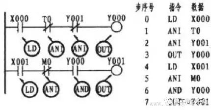 由第1梯级来看;X000、T0、Y001三触点成串联关系,即T0的常闭串接于X000的后端,而Y001的常闭则串接于T0常闭的后端。由于都是常闭故用ANI指令。现来看第2梯级;X000、M0、Y001,同样三触点也是串联关系,M0的常闭接点串接于X001的后端,而Y000的常开接点则串接于M0的后端。故M0的指令用ANI,而Y000的指令则用AND(具体编程详上图),只要是串联后面是常开的用AND,是常闭的则用ANI。可使用AND、ANI指令元件有:输入继电器X、输出继电器Y、辅助继电器M、定时器T、计数器C、状态继电器S。