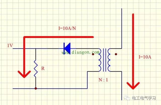 实用提示 电流互感中的二极管和副边绕组的电阻不会影响电流的测量,因为(只要阻抗不是无穷大)串联电路中电流处处相等,与串联的元件无关。