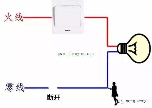 一,如上图所示当前端零线断开时,此时没有绝缘保护的情况下触碰后端的零线会触电,因为此时的零线已经变成了火线。