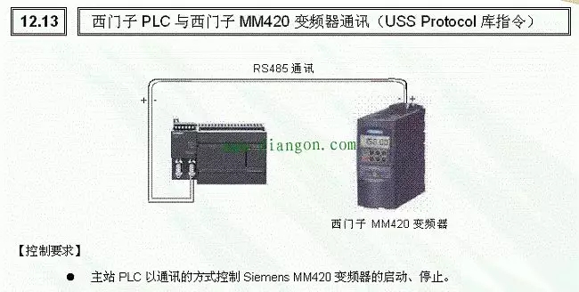 ③PLC与RS-485通信接口的连接。所有的标准西门子变频器都有一个RS-485串行接口(有的也提供RS-232接口),采用双线连接,其设计标准适用于工业环境的应用对象。单一的RS-485链路最多可以连接30台变频器,而且根据各变频器的地址或采用广播信息,都可以找到需要通信的变频器。链路中需要有一个主控制器(主站),而各个变频器则是从属的控制对象(从站)