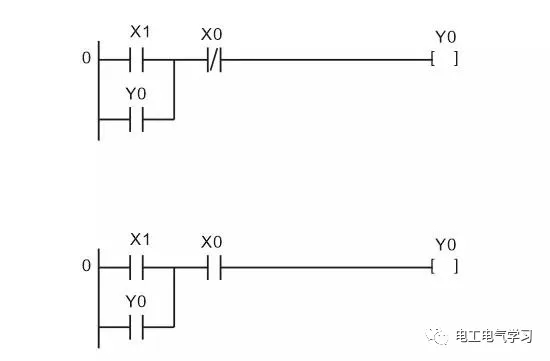 输入端的电气原理图中停止按钮SB0用常闭触点,串在控制线中,用于停机控制。启动按钮SB1用常开触点。在设计的两个梯形图完成的控制功能相同,但停机信号X0使用的触点类型不同,那么连接在端点的外部停机按钮触点类型也就不同