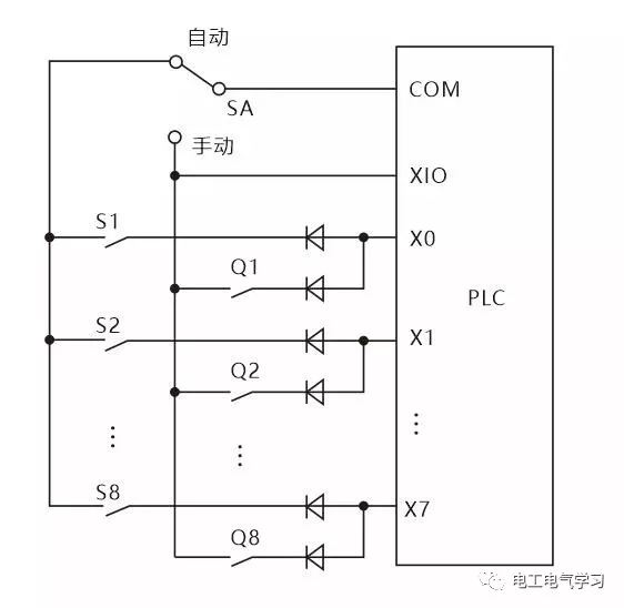 如图上系统分自动和手动两种工作方式,Q1-Q8为手动方式用到的 输入信号,S1-S8为自动方式用到的输入信号。S1和Q1共用输入点X0,PLC运行时只会用到其中一组信号,所以可以共用PLC的输入点。(图中二极管是用来防止寄生回路,避免错误输入信号的产生。