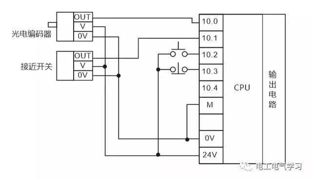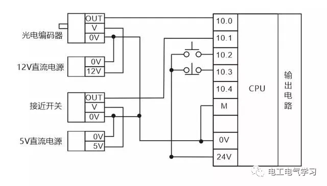 直流有源输入输入信号一般都是24V,这类信号与其他无源开关量信号混合接入PLC输入点时电压的0V点一定要接。上图输入点I0.0,I0.1连接光电编码器,接近开关的输出OUT信号,它们的驱动电源由PLC自身的24V电压提供