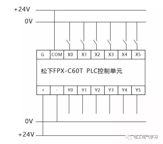 图中松下PLC为直流汇点式输入,即所以输入点共用一个公共端COM,同时COM端内带有DC24V电源,在编写程序时注意外部设备使用的是常闭还是常开触点