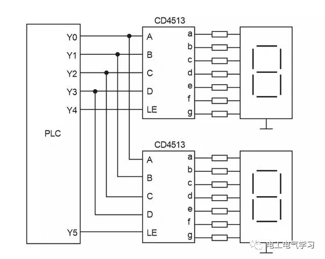 上图两只CD4513的数据输入端A-D共用PLC四个输出端Y0-Y3,A为最底D为最高,LE 为寄存输入端,当LE 为高电平时,输入数据将存在芯片内的寄存器中,并将其译码后显示出来。如PLC使用继电器输出模块时,与CD4513相连的输出各端在接一个下拉电阻,避免输出继电器断开的时候CD4513输入端悬空。