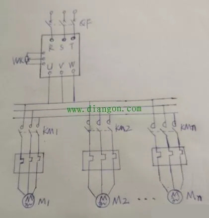 用一台变频器同时控制多台电动机的接线如图所示。